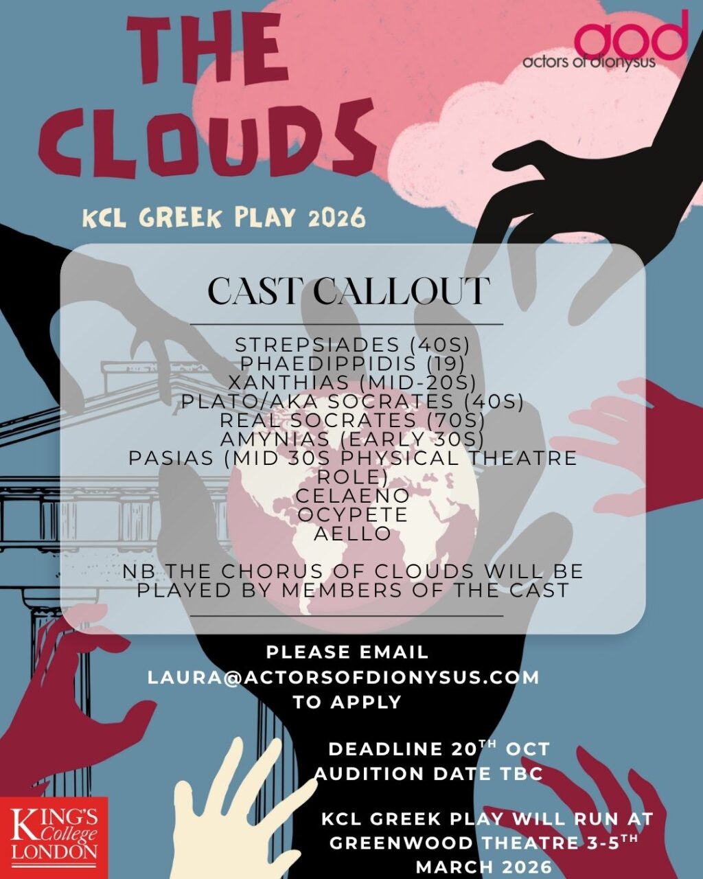 If you would like to be part of bringing @giulialbalsamo ‘s brilliant vision of The Clouds to life, we are looking for KCL students to fill the following roles: